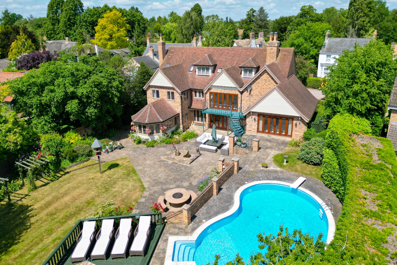 This prestigious home occupies a plot of just over an acre and was built with unique design features which include, a breath-taking principle bedroom suite with balcony and views over the south facing garden, four beautifully flowing reception rooms, five double bedrooms, all with en-suite, a heated outdoor pool and sun deck and a triple garage complex complete with gym.