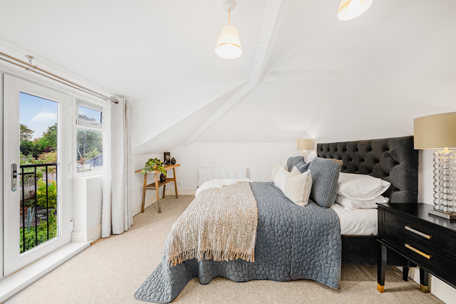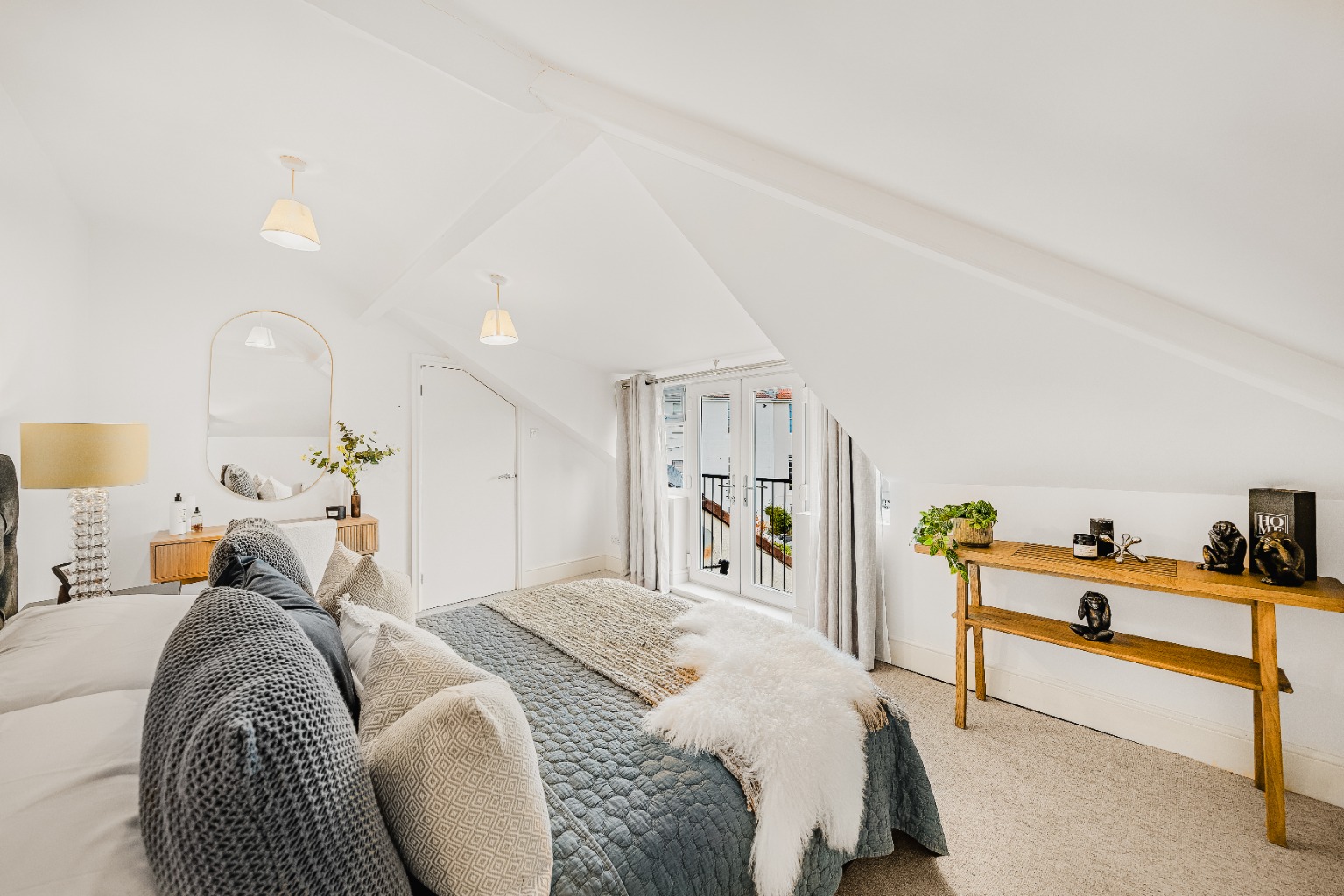 The living space unfolds over two levels, designed to maximise light and make clever use of the available floor area. The open plan kitchen and living room is both charming and practical, a bright, airy space with panoramic sash style windows, a glazed dormer, and elevated views across the rooftops. This room offers plenty of room for both dining and relaxation, with well defined zones and a layout that flows naturally. The recently renovated kitchen is stylish and efficient, fitted with a breakfast bar and an impressive range of integrated appliances including an oven, hob, fridge, freezer, dishwasher, washing machine, and wine cooler, perfect for hosting or enjoying quiet evenings at home.