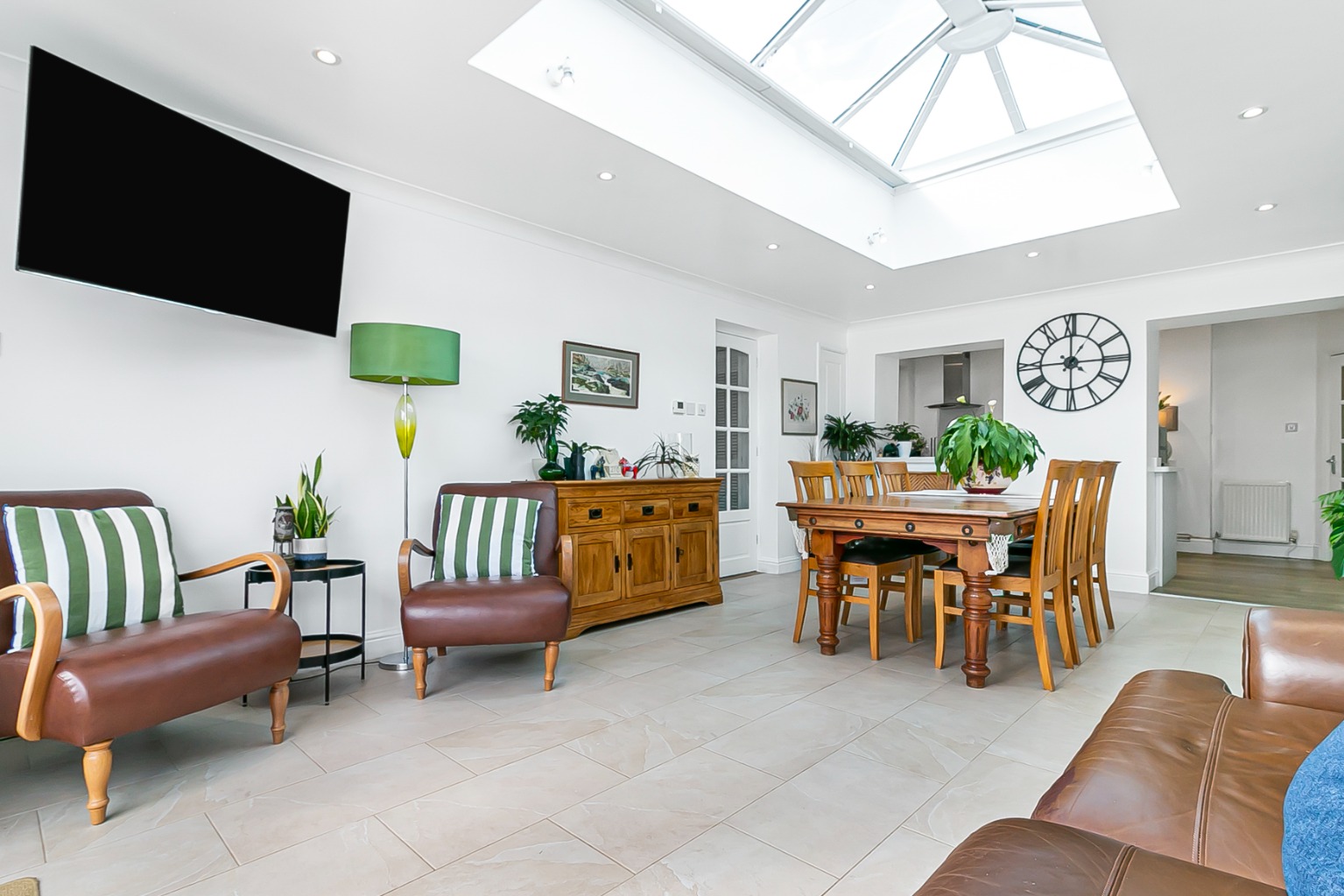A central dining hub — vaulted lantern roof and terrace doors make it the heart of the home