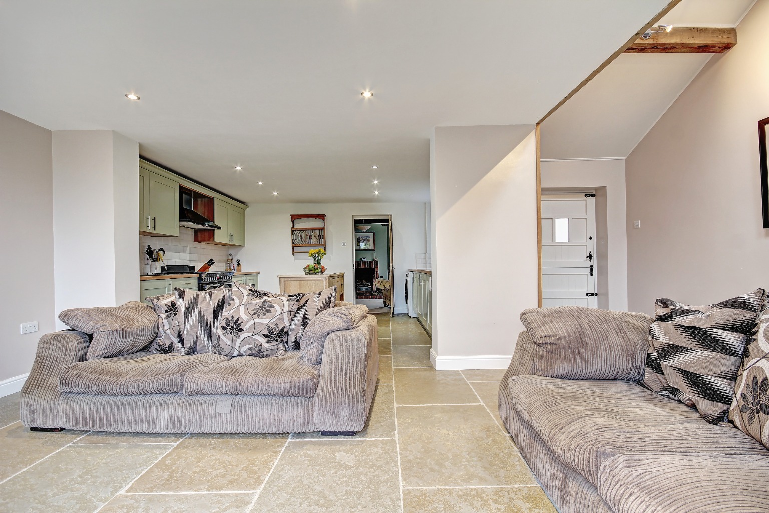 superb open-plan kitchen, dining and family room, with a striking flagstone floor. A side window, rooflight provide natural light, while bifold doors frame