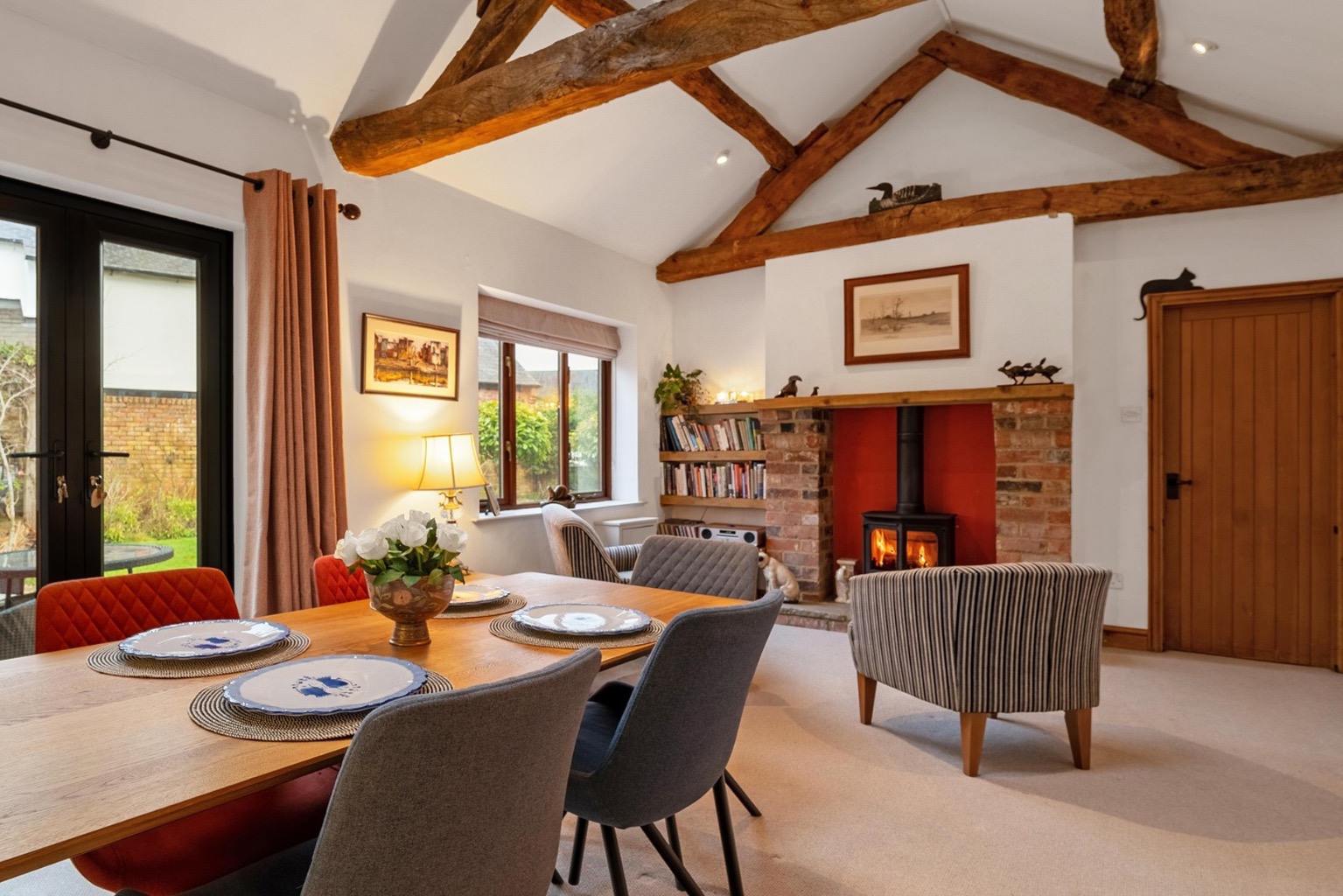 The heart of the home is the stunning bespoke kitchen, featuring quartz worktops, an Insinkerator boiling water tap and waste disposal, a Rangemaster oven, American-style fridge/freezer, integrated dishwasher, space for a microwave within the island, and a large built-in pantry. This flows seamlessly into an impressive open-plan dining and sitting area, where a cosy log burner creates a warm and inviting atmosphere, ideal for modern family living and entertaining. The space is flooded with natural light and enhanced by exposed beams and French doors opening onto the garden.