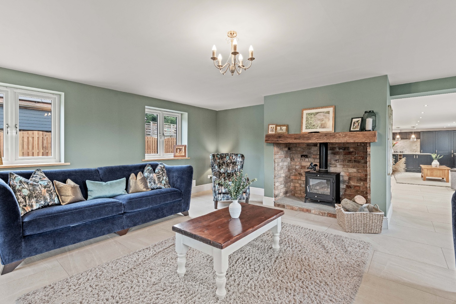 The lounge enjoys triple-aspect views and features an exposed brick fireplace with a bespoke oak beam and an inset wood-burning stove. The playroom/study is a bright and spacious area with bi-folding doors leading to a gravel sitting area and rear gardens. The ground floor accommodation is further enhanced by a high-quality cloakroom/WC, which includes a storage room.