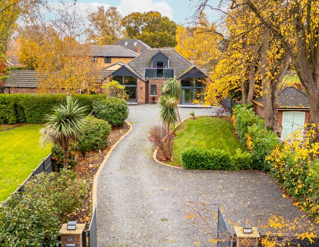 From the moment you turn onto the tree-lined driveway (elegantly illuminated for evening arrivals) you are met with architectural grace. Full-height glazing, a striking balcony, and a sense of calm sophistication.