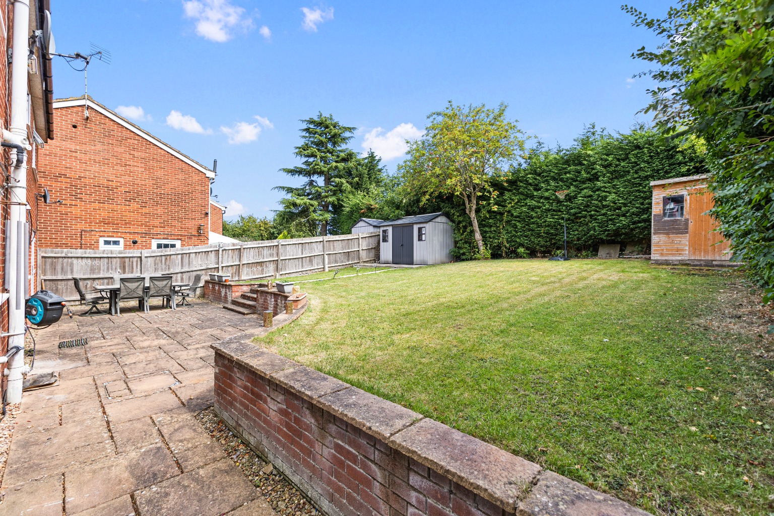The rear garden is a private and inviting space, thoughtfully laid out with a paved entertaining terrace, neat lawn, two storage sheds, and established borders that provide seclusion and greenery throughout the year.