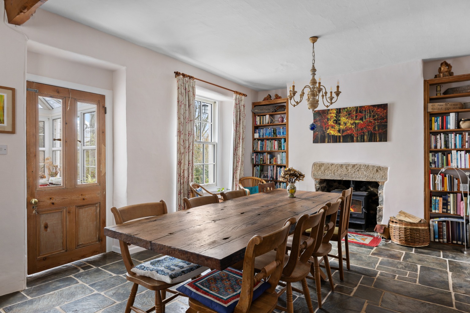 The sitting room is another wonderfully proportioned reception room, with windows to the front and side elevations and French doors opening into the conservatory. It is a bright and comfortable space with a wood burner and plenty of room for a full range of furniture. There is also a separate dining room, again with a wood burner, which offers excellent flexibility as a formal dining room, second sitting room, library or study. Together with the hall and study area, cloakroom and kitchenette, this part of the house could also work especially well for those seeking annexe-style potential for a dependent relative, guest accommodation or a degree of separation for multi-generational living.