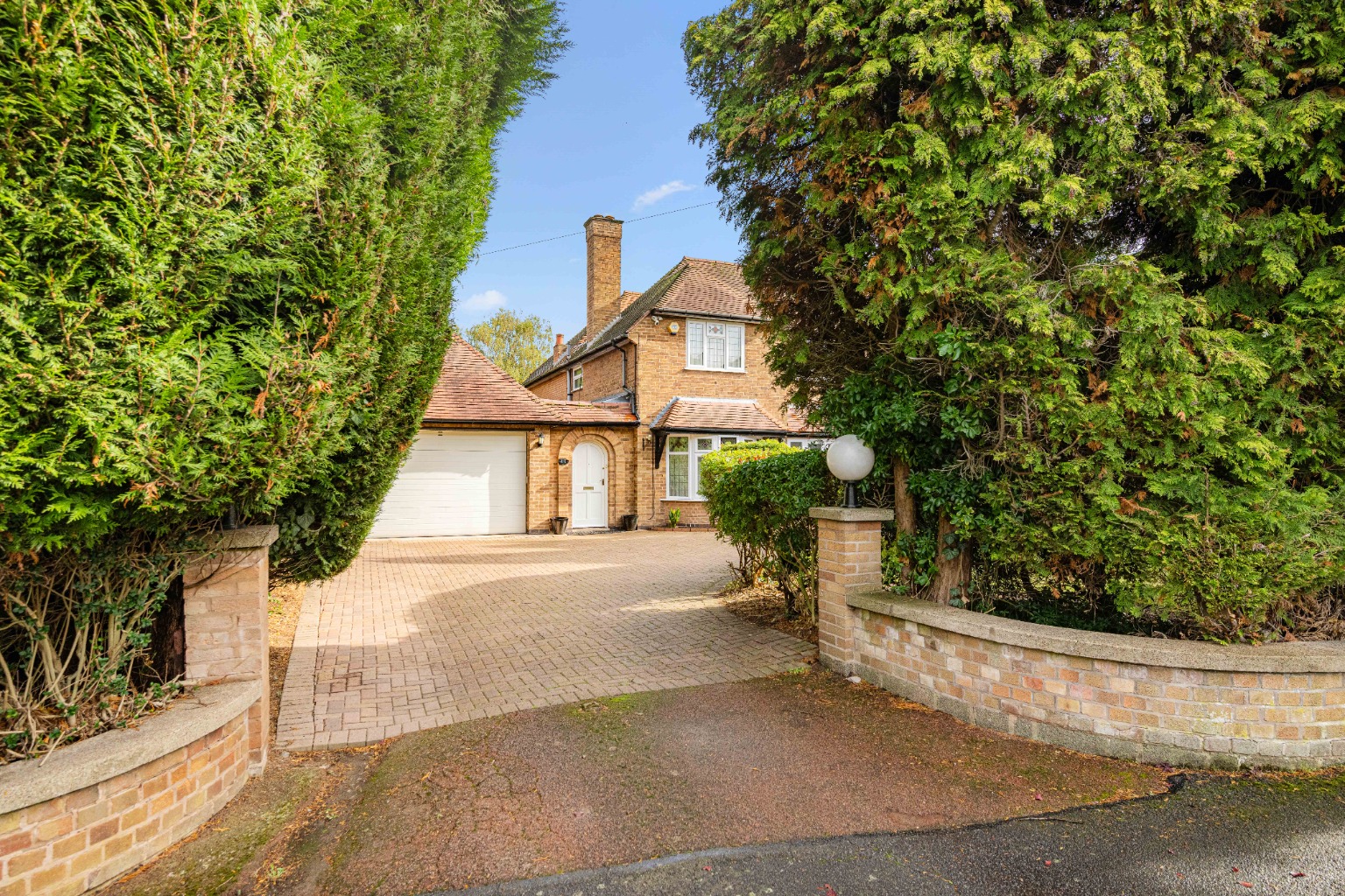 In and out driveway with manicured front lawns and an integral garage suitable for a large car