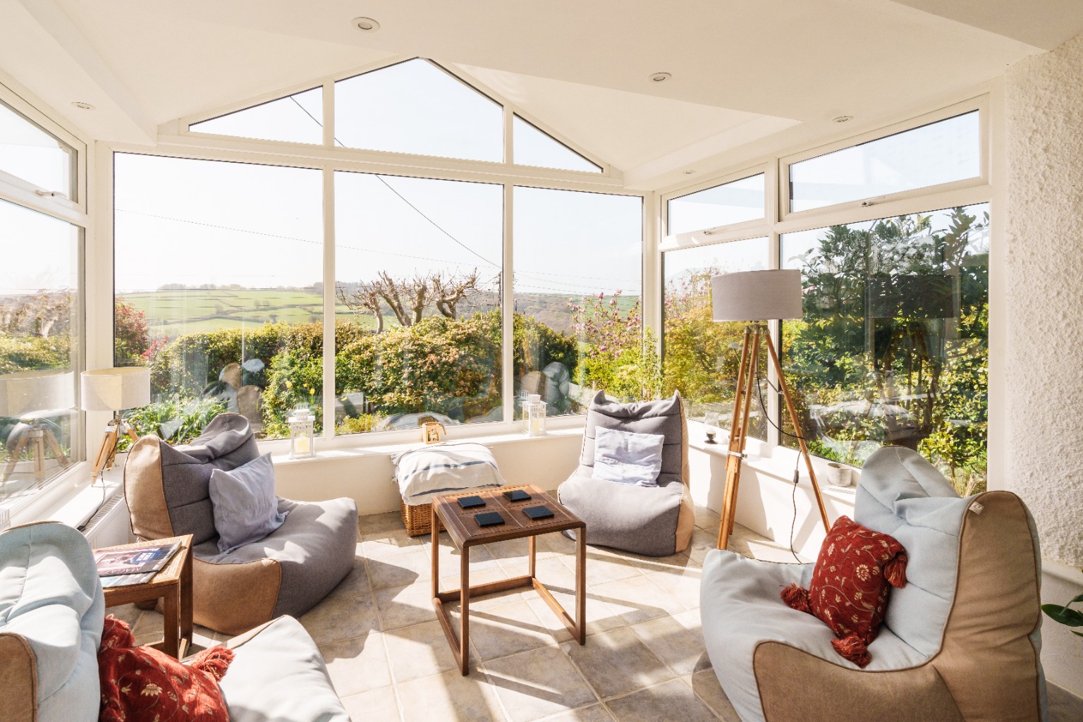 The sitting room has a calm, comfortable feel and connects directly into the garden room, which is one of the defining spaces of the house. Positioned to make the most of the view, this orangery style room with its vaulted ceiling and generous glazing draws the outside in and gives the house a strong connection with the garden and the valley beyond.