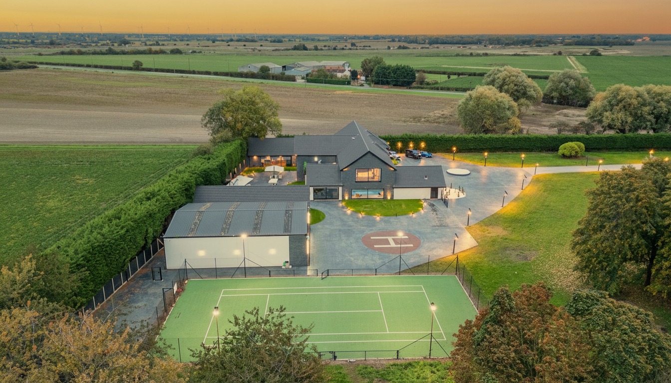 A private helipad and keyless entry - via electronic gates with facial recognition - set the tone for effortless sophistication. As dusk falls, the long-illuminated driveway guides you toward the home’s commanding presence. Extensive parking, a turning circle, tennis court, and the helipad, hint at the scale and grandeur that lie beyond.