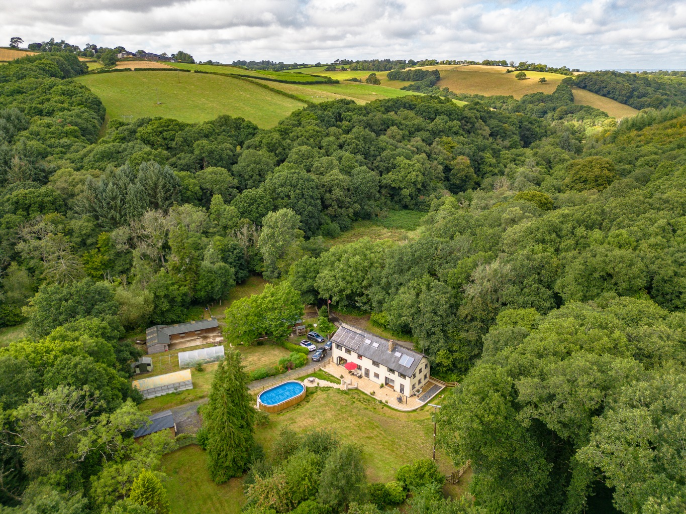 Down a quiet country lane, where trees lean close and the air hums with birdsong, Pensford lies cradled in the folds of a gentle Devon valley — untamed, unspoilt, and deeply private. A place to wake to mist over meadows, to walk among ancient oaks, and to hear nothing but the wind and the whisper of water through the trees.