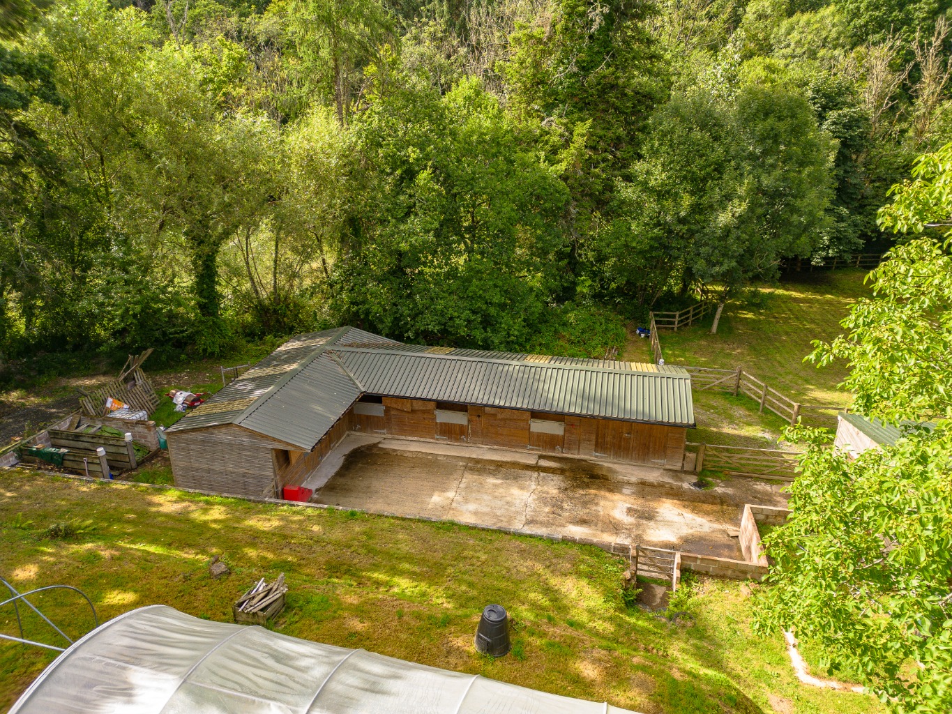 Private stable yard with road access – practical layout for horse owners or small-holding enthusiasts.