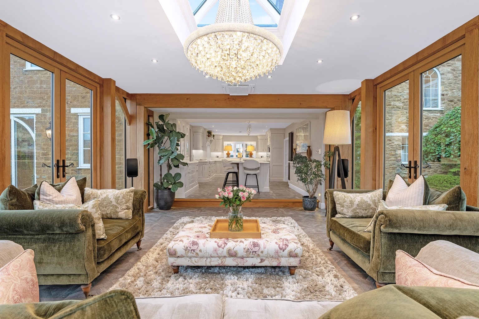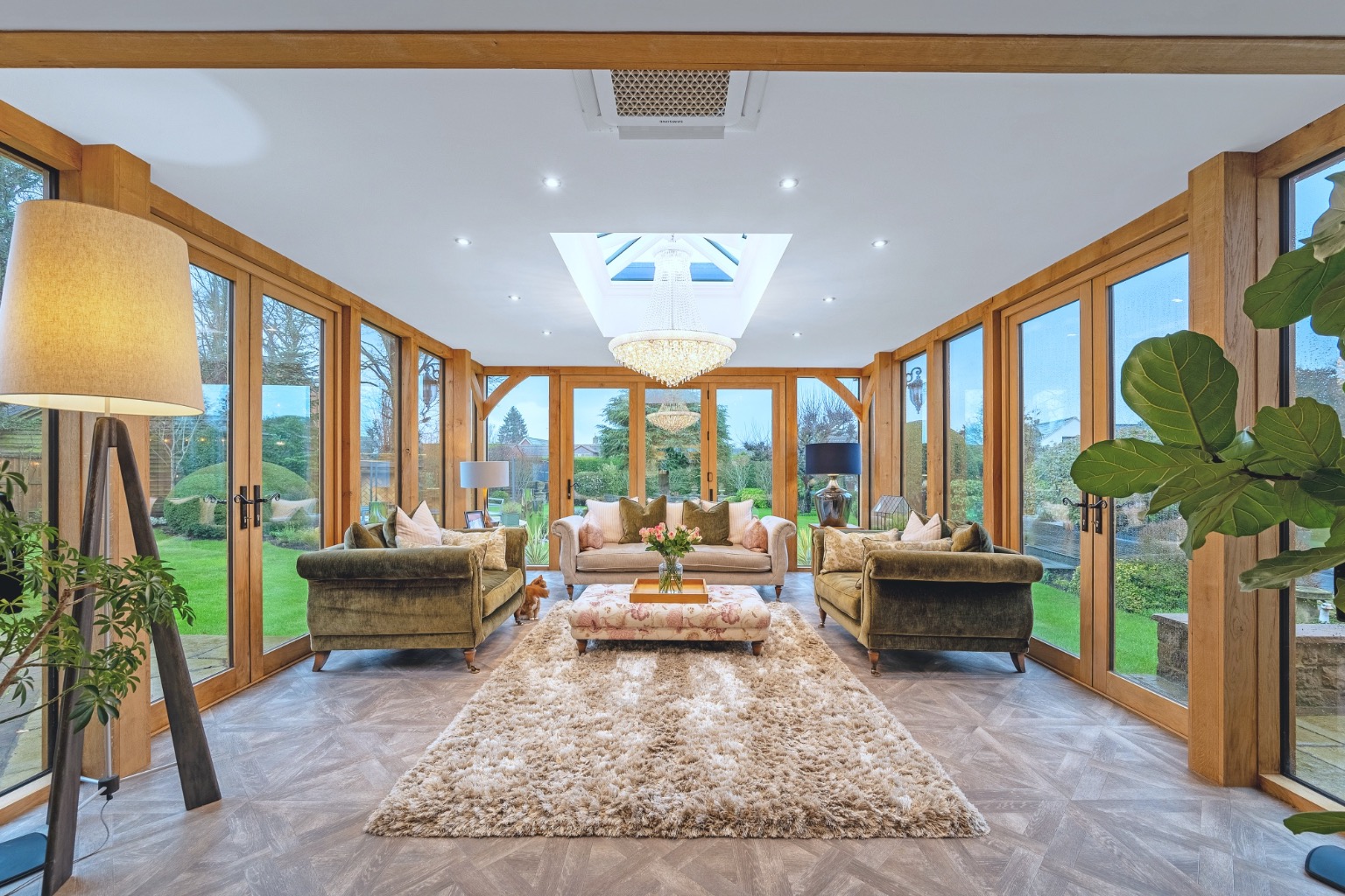 The kitchen flows seamlessly into the magnificent David Salisbury orangery, a light-filled sanctuary ideal for both everyday living and entertaining. Featuring underfloor heating, air conditioning, matching Amtico flooring, two sets of French doors and bi-fold doors opening onto the garden, it perfectly blends indoor and outdoor living.