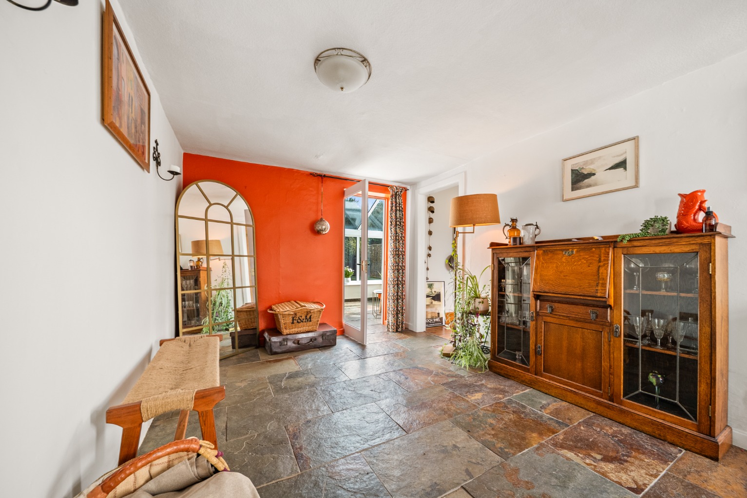 Stepping through the attractive timber front door, complete with brass letterbox and door knob, you are welcomed into a spacious hallway laid with striking slate floor tiles veined with copper tones. This practical yet characterful space sets the tone for the home and offers excellent potential to create a mudroom or boot room area.