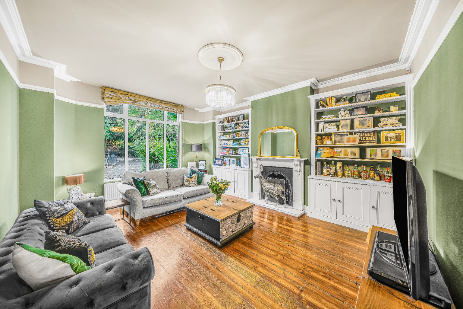 Step inside and you're welcomed by a generous entrance hallway, complete with tall ceilings, original cornicing, a feature fireplace, and a large under stairs storage cupboard. The bay fronted reception room to the front of the house is a standout, light-filled and elegant, with bespoke fitted cabinetry, a cast iron open fireplace with marble surround, and sweeping views over the park.
