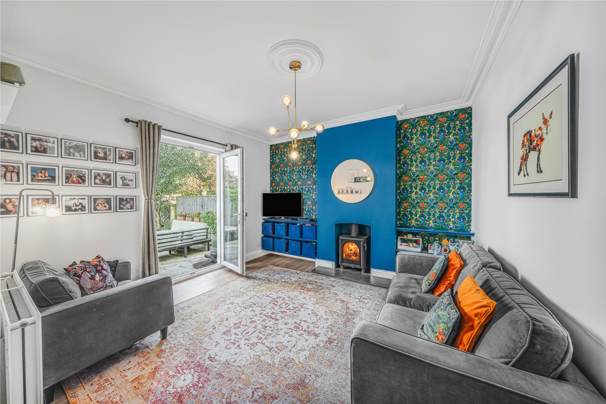 At the rear of the ground floor, the open plan kitchen, dining and snug area forms the true heart of the home. The snug includes a Handöl wood burning stove and French doors that open directly onto the garden patio. The dining area retains a period style gas fireplace with ornate surround, while the kitchen is fully fitted with a Leisure range cooker with six gas burners and three ovens, an integrated Bosch dishwasher, a Samsung American style fridge freezer, a large breakfast larder cupboard, and a wide array of fitted cabinetry. A separate utility room offers additional storage, a sink, garden access, and houses a Vaillant boiler. A guest WC and a second storage cupboard complete the ground floor.