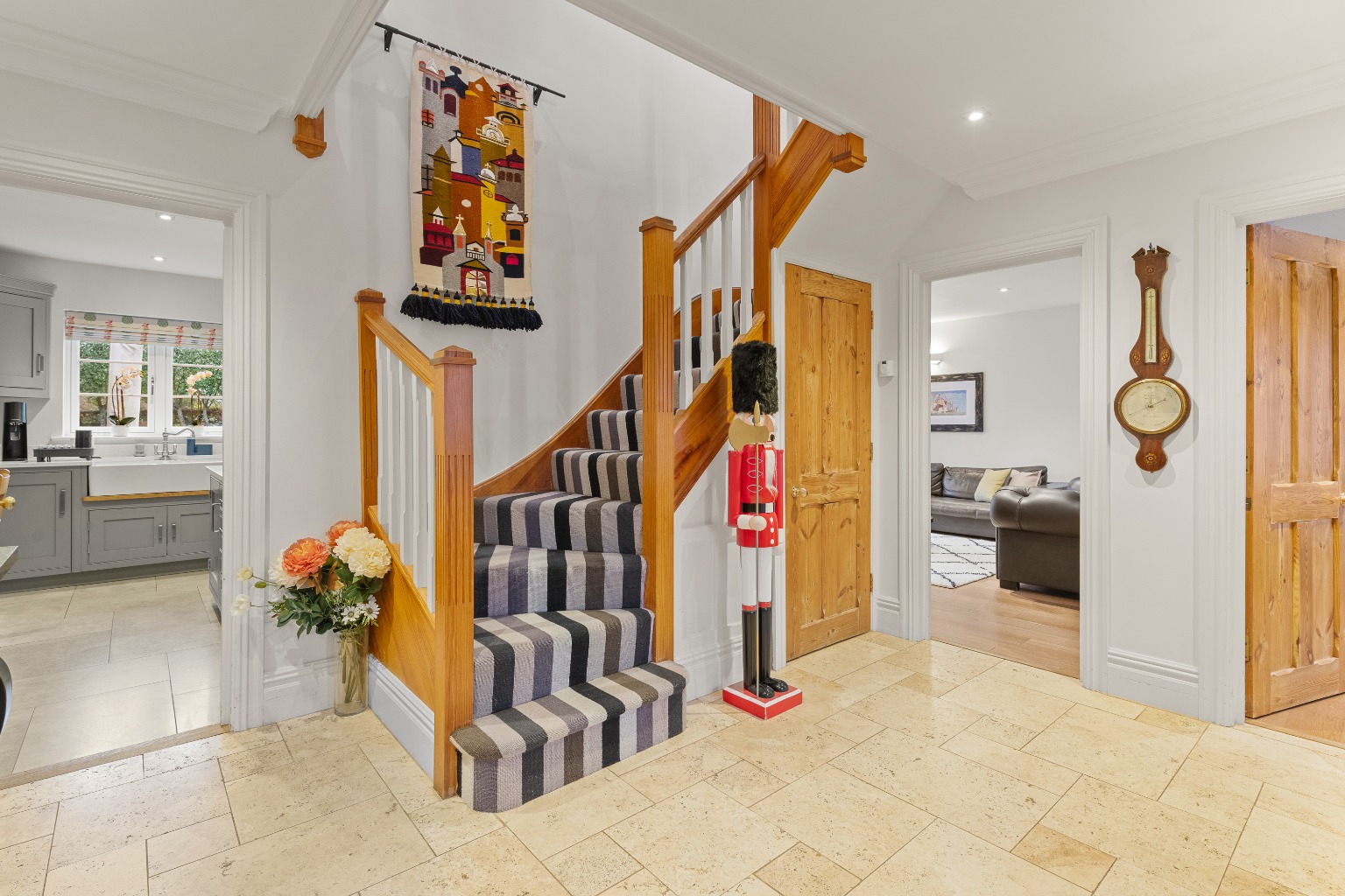 The reception hall creates an immediate sense of scale with tiled flooring, feature windows and an oak staircase rising to the galleried landing. From here the ground floor leads into a series of bright and well laid out rooms. The main sitting room offers two seating areas and an open fire with a limestone surround. To the front is a snug, ideal for day-to-day use, and a separate study for those needing a quiet workspace.