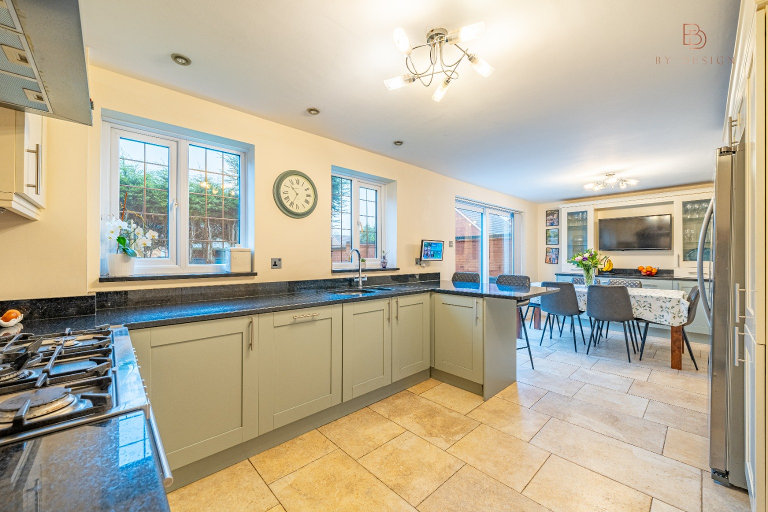 Sliding patio doors lead out to rear garden, a media style unit to compliment the kitchen units stands to one wall, ample room for large dining table, modern vertical radiator to wall.