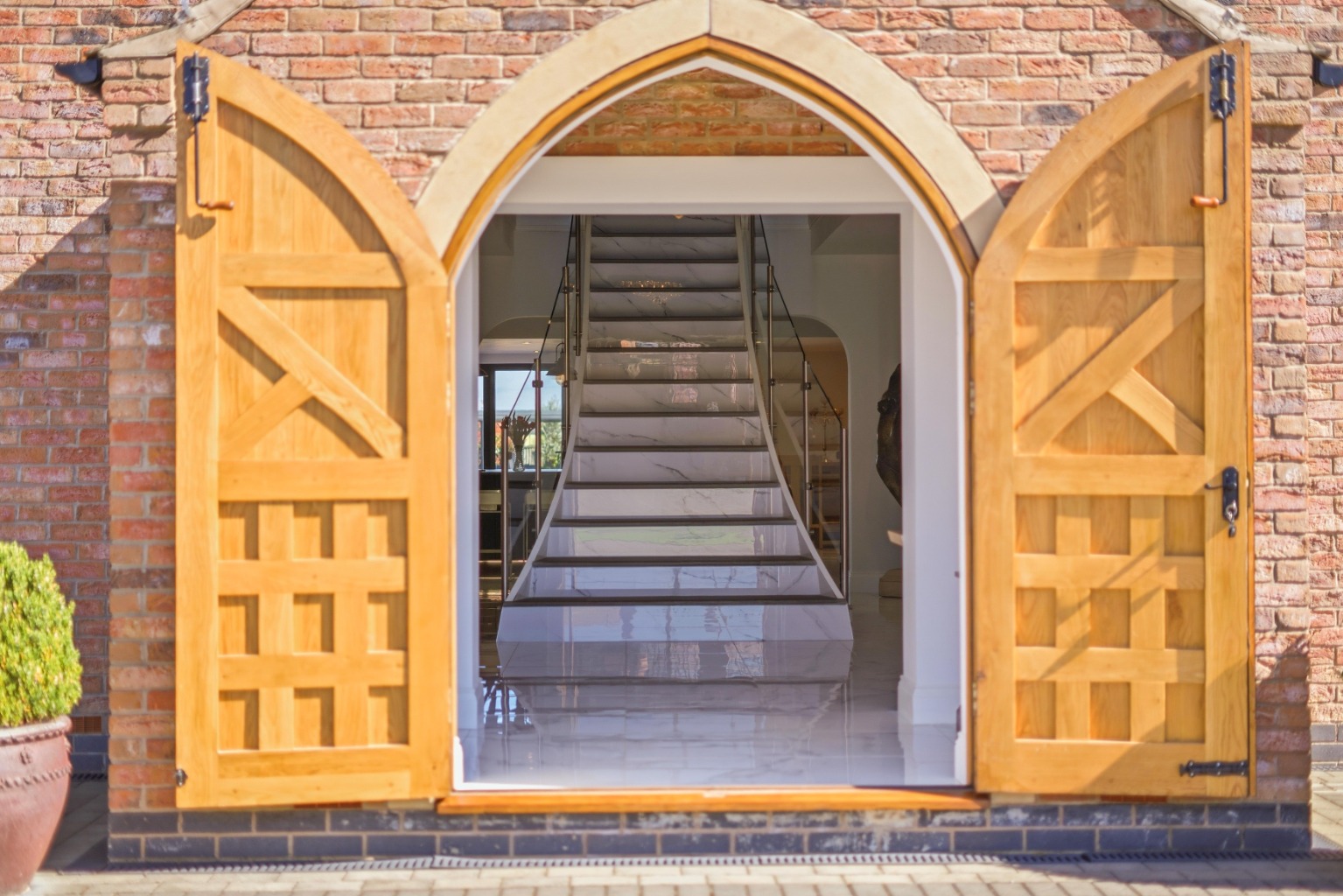 The solid oak entrance door offers a quiet indication of what awaits beyond. The grand entrance hall rises through the centre of the home. Marble flooring reflects the light. Solid oak doors bring warmth and substance. The staircase forms a focal point that feels both purposeful and assured.