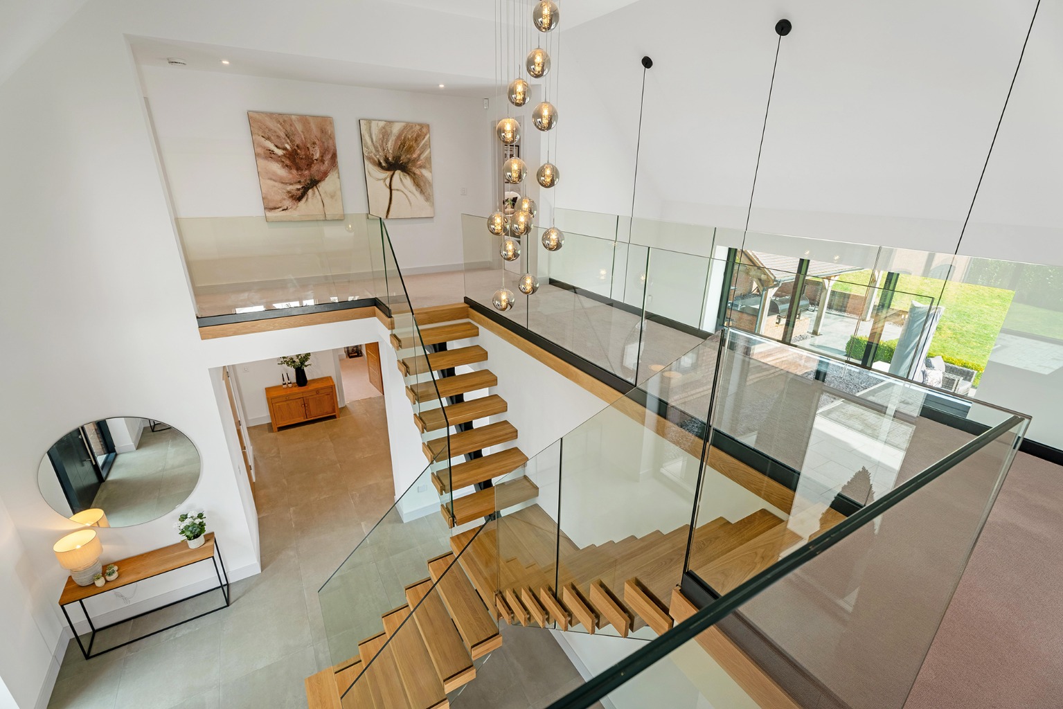 The first and second floors are connected by wide landings and staircases, which are finished in oak and glass. The two wings of the property are connected by a gorgeous central mezzanine landing finished in oak and glass, which looks down to the entrance foyer and out to the rear garden.