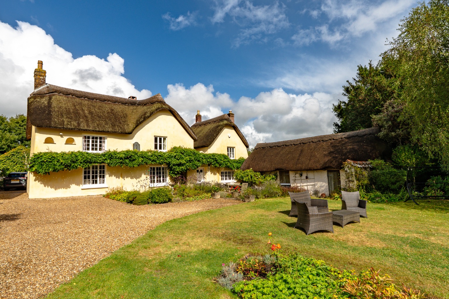 Outbuildings and garaging: detached triple garage (28’9” x 27’1”), ample turning and parking, utility/laundry room, workshop, and a charming thatched outbuilding with WC and storage.